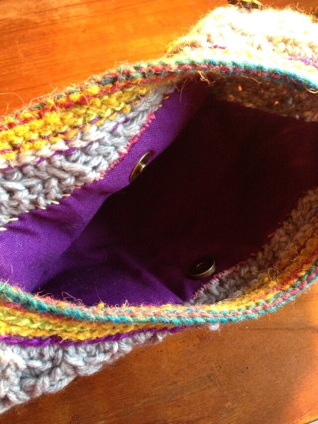 クラッチバッグにはパープルの内布を手縫でつけました。